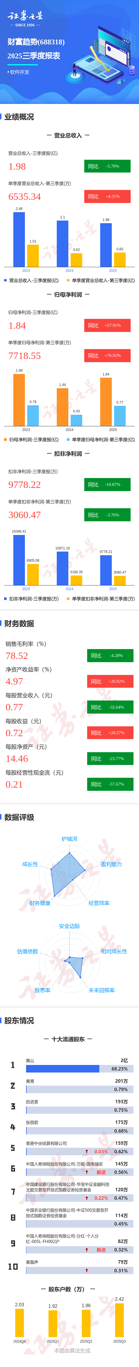 证券之星消息,财富趋势2025年三季报显示,前三季度公司主营收入1.98亿元,同比下降5.71%;归母净利润1.84亿元,同比上升27.91%;扣非净利润9778.22万元,同比下降10.87%;其中2025年第三季度,公司单季度主营收入6535.34万元,同比上升4.31%;单季度归母净利润7718.55万元,同比上升76.93%;单季度扣非净利润3060.47万元,同比下降3.77%;负债率4.76%,投资收益5091.97万元,财务费用-1808.96万元,毛利率78.52%。