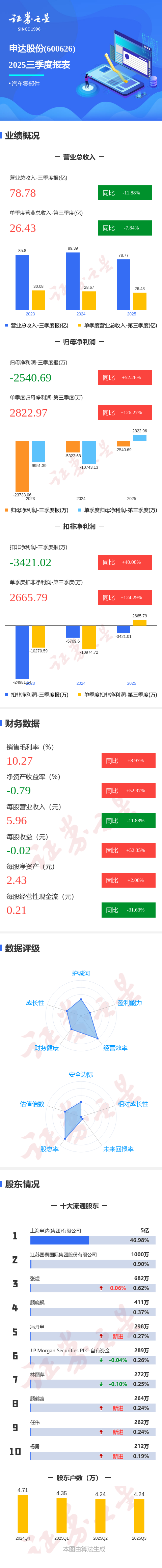 证券之星消息,申达股份2025年三季报显示,前三季度公司主营收入78.78亿元,同比下降11.88%;归母净利润-2540.69万元,同比上升52.27%;扣非净利润-3421.02万元,同比上升40.08%;其中2025年第三季度,公司单季度主营收入26.43亿元,同比下降7.84%;单季度归母净利润2822.97万元,同比上升126.28%;单季度扣非净利润2665.79万元,同比上升124.29%;负债率64.58%,投资收益1.09亿元,财务费用2.34亿元,毛利率10.27%。