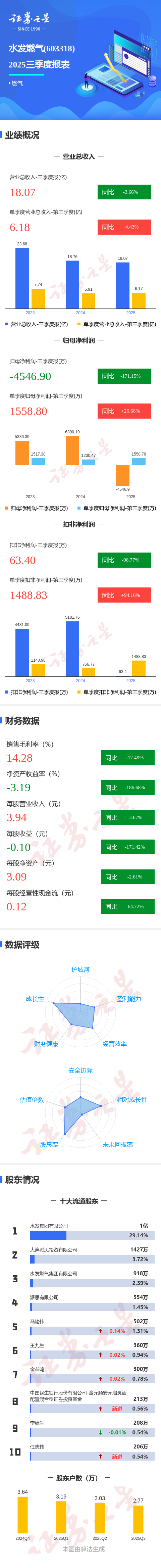 证券之星消息,水发燃气2025年三季报显示,前三季度公司主营收入18.07亿元,同比下降3.67%;归母净利润-4546.9万元,同比下降171.15%;扣非净利润63.4万元,同比下降98.78%;其中2025年第三季度,公司单季度主营收入6.18亿元,同比上升4.43%;单季度归母净利润1558.8万元,同比上升26.68%;单季度扣非净利润1488.83万元,同比上升94.17%;负债率58.26%,投资收益1346.51万元,财务费用6520.15万元,毛利率14.28%。