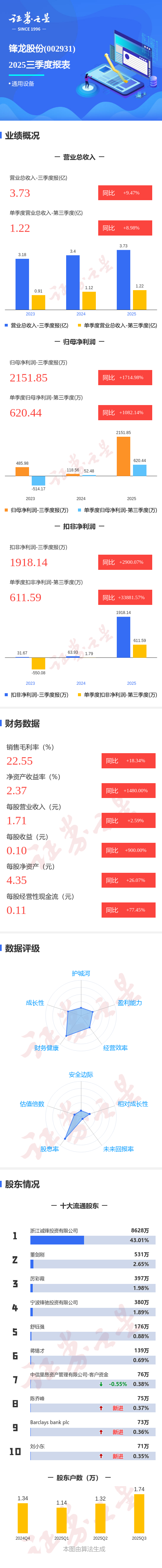 证券之星消息,锋龙股份2025年三季报显示,前三季度公司主营收入3.73亿元,同比上升9.47%;归母净利润2151.85万元,同比上升1714.99%;扣非净利润1918.14万元,同比上升2900.07%;其中2025年第三季度,公司单季度主营收入1.22亿元,同比上升8.99%;单季度归母净利润620.44万元,同比上升1082.14%;单季度扣非净利润611.59万元,同比上升33881.57%;负债率15.92%,投资收益113.13万元,财务费用-347.73万元,毛利率22.55%。