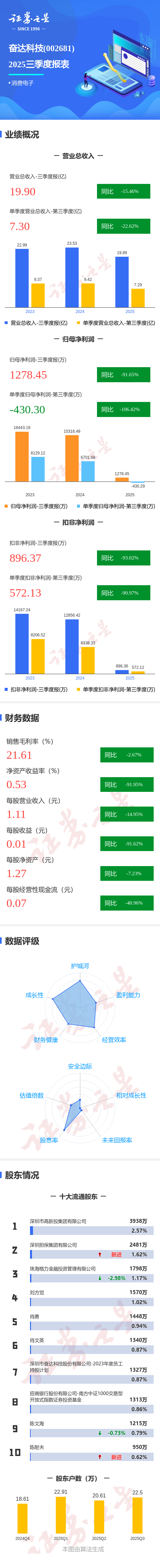 证券之星消息,奋达科技2025年三季报显示,前三季度公司主营收入19.9亿元,同比下降15.46%;归母净利润1278.45万元,同比下降91.65%;扣非净利润896.37万元,同比下降93.03%;其中2025年第三季度,公司单季度主营收入7.3亿元,同比下降22.62%;单季度归母净利润-430.3万元,同比下降106.42%;单季度扣非净利润572.13万元,同比下降90.97%;负债率50.54%,投资收益602.46万元,财务费用2640.98万元,毛利率21.61%。