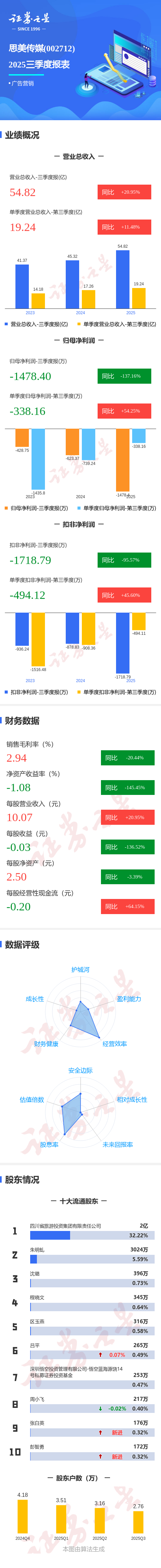 证券之星消息,思美传媒2025年三季报显示,前三季度公司主营收入54.82亿元,同比上升20.96%;归母净利润-1478.4万元,同比下降137.16%;扣非净利润-1718.79万元,同比下降95.58%;其中2025年第三季度,公司单季度主营收入19.24亿元,同比上升11.49%;单季度归母净利润-338.16万元,同比上升54.26%;单季度扣非净利润-494.12万元,同比上升45.6%;负债率53.73%,投资收益91.69万元,财务费用1989.7万元,毛利率2.94%。