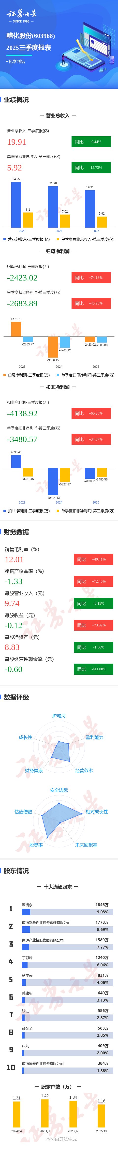 证券之星消息,醋化股份2025年三季报显示,前三季度公司主营收入19.91亿元,同比下降9.44%;归母净利润-2423.02万元,同比上升74.19%;扣非净利润-4138.92万元,同比上升60.26%;其中2025年第三季度,公司单季度主营收入5.92亿元,同比下降15.74%;单季度归母净利润-2683.89万元,同比上升45.93%;单季度扣非净利润-3480.57万元,同比上升34.67%;负债率44.36%,投资收益-47.13万元,财务费用1088.32万元,毛利率12.01%。
