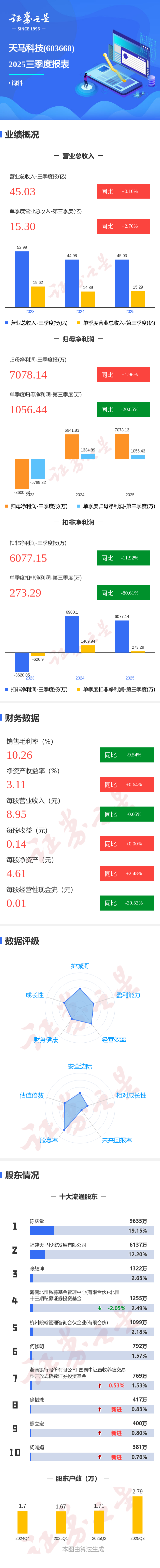 证券之星消息,天马科技2025年三季报显示,前三季度公司主营收入45.03亿元,同比上升0.11%;归母净利润7078.14万元,同比上升1.96%;扣非净利润6077.15万元,同比下降11.93%;其中2025年第三季度,公司单季度主营收入15.3亿元,同比上升2.71%;单季度归母净利润1056.44万元,同比下降20.86%;单季度扣非净利润273.29万元,同比下降80.62%;负债率69.73%,投资收益-977.73万元,财务费用1.31亿元,毛利率10.26%。