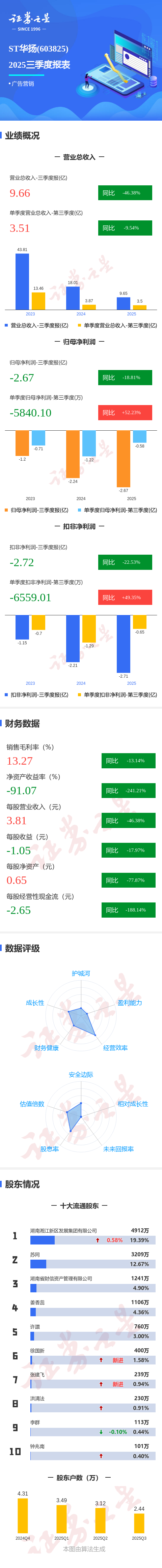证券之星消息,ST华扬2025年三季报显示,前三季度公司主营收入9.66亿元,同比下降46.39%;归母净利润-2.67亿元,同比下降18.82%;扣非净利润-2.72亿元,同比下降22.54%;其中2025年第三季度,公司单季度主营收入3.51亿元,同比下降9.54%;单季度归母净利润-5840.1万元,同比上升52.23%;单季度扣非净利润-6559.01万元,同比上升49.36%;负债率94.14%,投资收益-187.81万元,财务费用4787.52万元,毛利率13.27%。