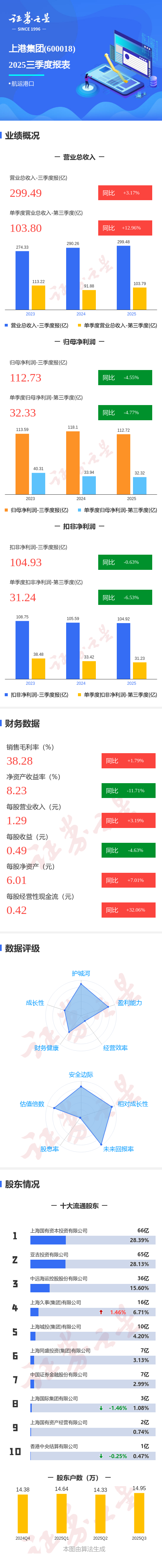 证券之星消息,上港集团2025年三季报显示,前三季度公司主营收入299.49亿元,同比上升3.18%;归母净利润112.73亿元,同比下降4.56%;扣非净利润104.93亿元,同比下降0.64%;其中2025年第三季度,公司单季度主营收入103.8亿元,同比上升12.96%;单季度归母净利润32.33亿元,同比下降4.77%;单季度扣非净利润31.24亿元,同比下降6.54%;负债率29.84%,投资收益64.46亿元,财务费用4.28亿元,毛利率38.28%。