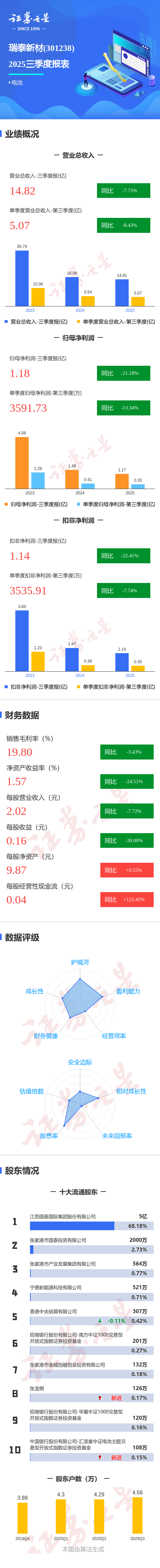证券之星消息,瑞泰新材2025年三季报显示,前三季度公司主营收入14.82亿元,同比下降7.73%;归母净利润1.18亿元,同比下降21.18%;扣非净利润1.14亿元,同比下降22.42%;其中2025年第三季度,公司单季度主营收入5.07亿元,同比下降8.44%;单季度归母净利润3591.73万元,同比下降13.34%;单季度扣非净利润3535.91万元,同比下降7.75%;负债率20.54%,投资收益3967.65万元,财务费用556.8万元,毛利率19.8%。
