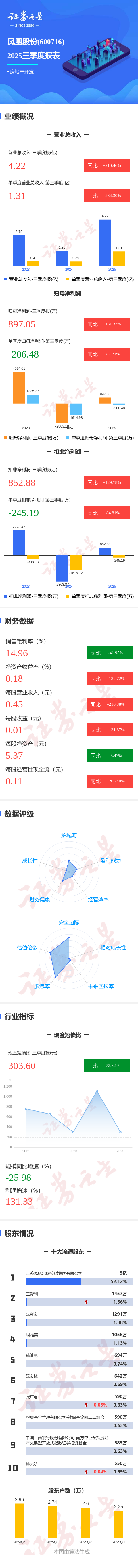 证券之星消息,凤凰股份2025年三季报显示,前三季度公司主营收入4.22亿元,同比上升210.46%;归母净利润897.05万元,同比上升131.33%;扣非净利润852.88万元,同比上升129.78%;其中2025年第三季度,公司单季度主营收入1.31亿元,同比上升234.3%;单季度归母净利润-206.48万元,同比上升87.21%;单季度扣非净利润-245.19万元,同比上升84.82%;负债率29.67%,投资收益2265.55万元,财务费用2567.44万元,毛利率14.96%。