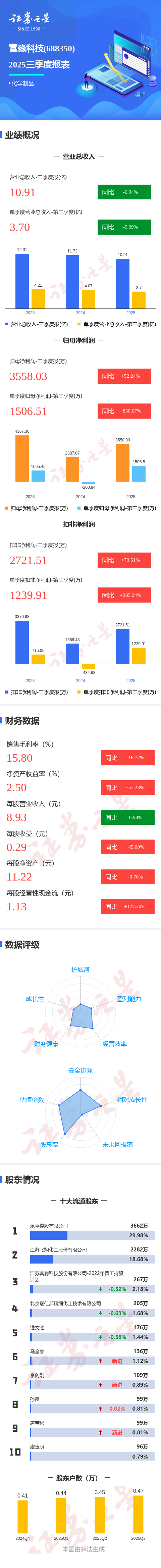 证券之星消息,富淼科技2025年三季报显示,前三季度公司主营收入10.91亿元,同比下降6.94%;归母净利润3558.03万元,同比上升52.24%;扣非净利润2721.51万元,同比上升73.52%;其中2025年第三季度,公司单季度主营收入3.7亿元,同比下降9.1%;单季度归母净利润1506.51万元,同比上升850.07%;单季度扣非净利润1239.91万元,同比上升385.24%;负债率45.01%,投资收益210.61万元,财务费用993.61万元,毛利率15.8%。