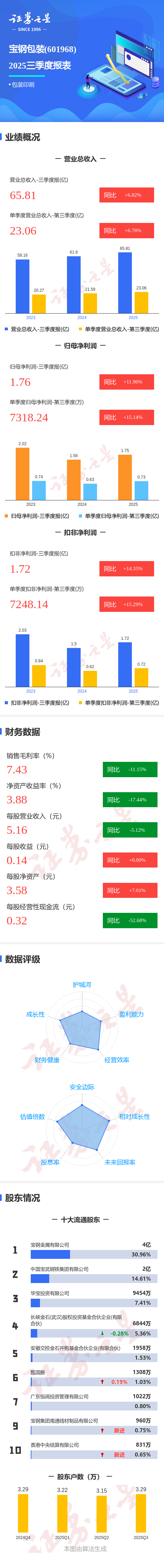 证券之星消息,宝钢包装2025年三季报显示,前三季度公司主营收入65.81亿元,同比上升6.83%;归母净利润1.76亿元,同比上升11.97%;扣非净利润1.72亿元,同比上升14.36%;其中2025年第三季度,公司单季度主营收入23.06亿元,同比上升6.78%;单季度归母净利润7318.24万元,同比上升15.15%;单季度扣非净利润7248.14万元,同比上升15.29%;负债率51.07%,投资收益-2420.47万元,财务费用762.24万元,毛利率7.43%。