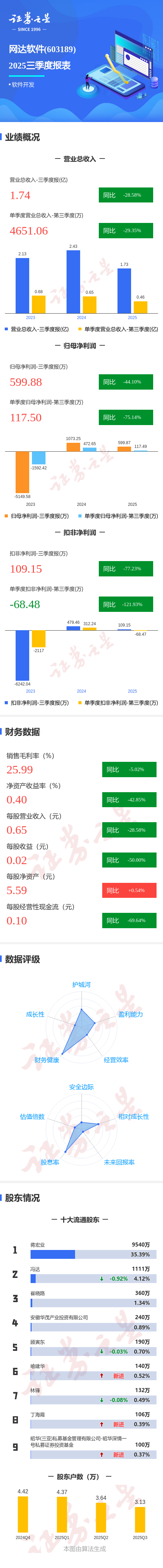证券之星消息,网达软件2025年三季报显示,前三季度公司主营收入1.74亿元,同比下降28.58%;归母净利润599.88万元,同比下降44.11%;扣非净利润109.15万元,同比下降77.23%;其中2025年第三季度,公司单季度主营收入4651.06万元,同比下降29.36%;单季度归母净利润117.5万元,同比下降75.14%;单季度扣非净利润-68.48万元,同比下降121.93%;负债率6.09%,投资收益412.66万元,财务费用-250.09万元,毛利率25.99%。