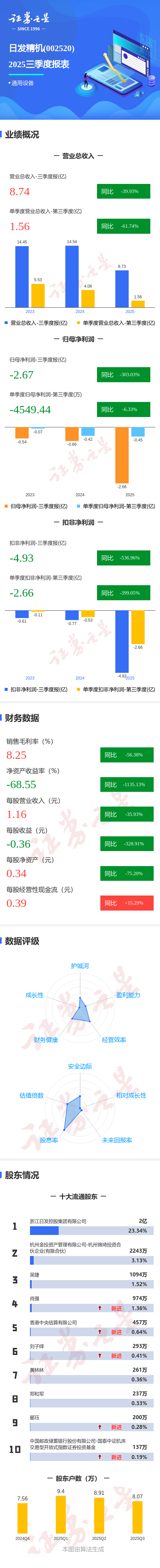 证券之星消息,日发精机2025年三季报显示,前三季度公司主营收入8.74亿元,同比下降39.94%;归母净利润-2.67亿元,同比下降303.03%;扣非净利润-4.93亿元,同比下降536.96%;其中2025年第三季度,公司单季度主营收入1.56亿元,同比下降61.74%;单季度归母净利润-4549.44万元,同比下降6.33%;单季度扣非净利润-2.66亿元,同比下降399.06%;负债率89.64%,投资收益2.22亿元,财务费用2017.81万元,毛利率8.25%。