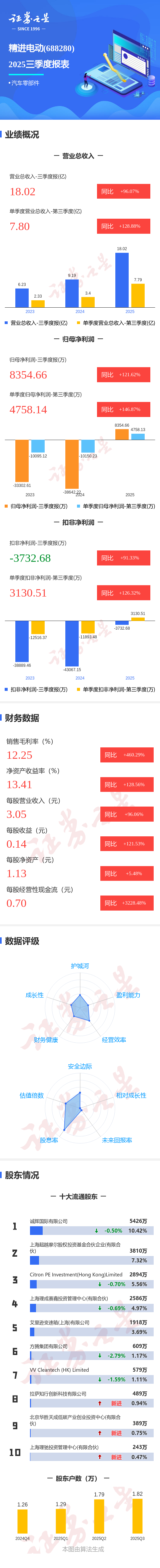 证券之星消息,精进电动2025年三季报显示,前三季度公司主营收入18.02亿元,同比上升96.07%;归母净利润8354.66万元,同比上升121.62%;扣非净利润-3732.68万元,同比上升91.33%;其中2025年第三季度,公司单季度主营收入7.8亿元,同比上升128.89%;单季度归母净利润4758.14万元,同比上升146.88%;单季度扣非净利润3130.51万元,同比上升126.32%;负债率78.23%,投资收益-276.12万元,财务费用1865.82万元,毛利率12.25%。