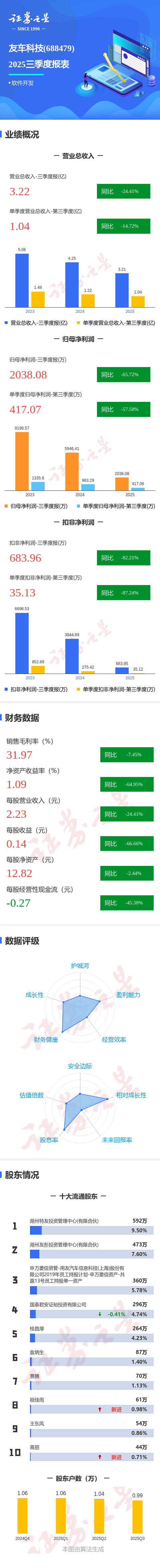 证券之星消息,友车科技2025年三季报显示,前三季度公司主营收入3.22亿元,同比下降24.42%;归母净利润2038.08万元,同比下降65.73%;扣非净利润683.96万元,同比下降82.21%;其中2025年第三季度,公司单季度主营收入1.04亿元,同比下降14.73%;单季度归母净利润417.07万元,同比下降57.58%;单季度扣非净利润35.13万元,同比下降87.25%;负债率10.41%,财务费用-770.31万元,毛利率31.97%。