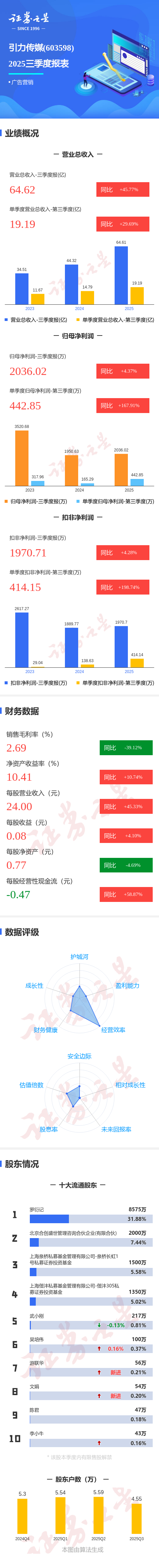 证券之星消息,引力传媒2025年三季报显示,前三季度公司主营收入64.62亿元,同比上升45.78%;归母净利润2036.02万元,同比上升4.38%;扣非净利润1970.71万元,同比上升4.28%;其中2025年第三季度,公司单季度主营收入19.19亿元,同比上升29.7%;单季度归母净利润442.85万元,同比上升167.91%;单季度扣非净利润414.15万元,同比上升198.74%;负债率87.83%,投资收益-33.78万元,财务费用1049.56万元,毛利率2.69%。