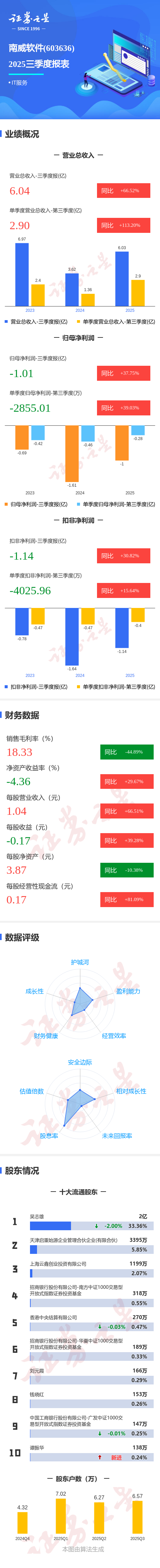 证券之星消息,南威软件2025年三季报显示,前三季度公司主营收入6.04亿元,同比上升66.52%;归母净利润-1.01亿元,同比上升37.75%;扣非净利润-1.14亿元,同比上升30.83%;其中2025年第三季度,公司单季度主营收入2.9亿元,同比上升113.21%;单季度归母净利润-2855.01万元,同比上升39.03%;单季度扣非净利润-4025.96万元,同比上升15.64%;负债率57.86%,投资收益770.4万元,财务费用2060.67万元,毛利率18.33%。