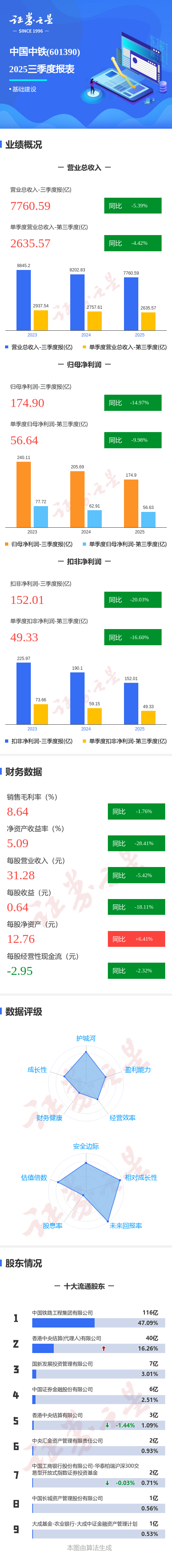 证券之星消息,中国中铁2025年三季报显示,前三季度公司主营收入7760.59亿元,同比下降5.39%;归母净利润174.9亿元,同比下降14.97%;扣非净利润152.01亿元,同比下降20.04%;其中2025年第三季度,公司单季度主营收入2635.57亿元,同比下降4.43%;单季度归母净利润56.64亿元,同比下降9.98%;单季度扣非净利润49.33亿元,同比下降16.61%;负债率77.88%,投资收益2.12亿元,财务费用59.85亿元,毛利率8.64%。