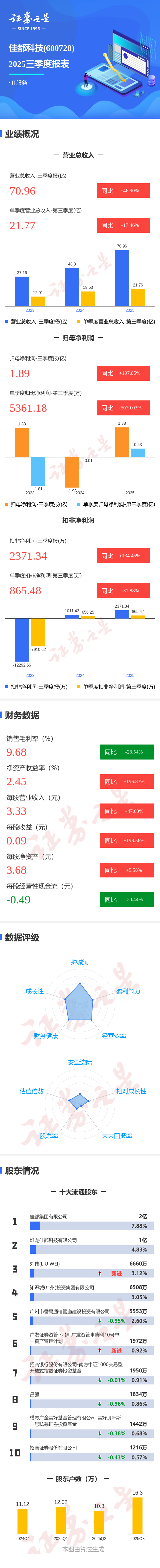 证券之星消息,佳都科技2025年三季报显示,前三季度公司主营收入70.96亿元,同比上升46.9%;归母净利润1.89亿元,同比上升197.85%;扣非净利润2371.34万元,同比上升134.45%;其中2025年第三季度,公司单季度主营收入21.77亿元,同比上升17.47%;单季度归母净利润5361.18万元,同比上升5070.04%;单季度扣非净利润865.48万元,同比上升31.88%;负债率48.33%,投资收益3646.88万元,财务费用-138.56万元,毛利率9.68%。