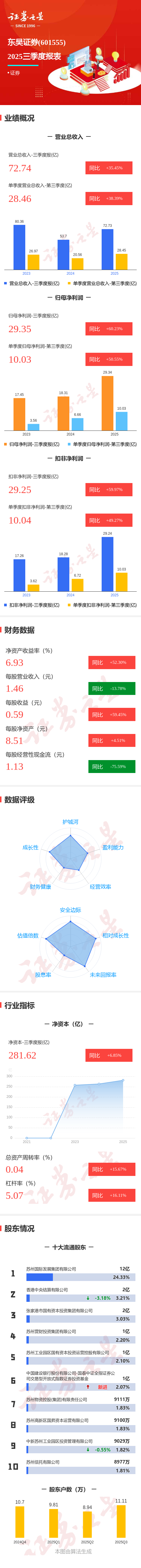 证券之星消息,东吴证券2025年三季报显示,前三季度公司主营收入72.74亿元,同比上升35.45%;归母净利润29.35亿元,同比上升60.23%;扣非净利润29.25亿元,同比上升59.98%;其中2025年第三季度,公司单季度主营收入28.46亿元,同比上升38.39%;单季度归母净利润10.03亿元,同比上升50.56%;单季度扣非净利润10.04亿元,同比上升49.28%;负债率80.26%,投资收益28.93亿元。