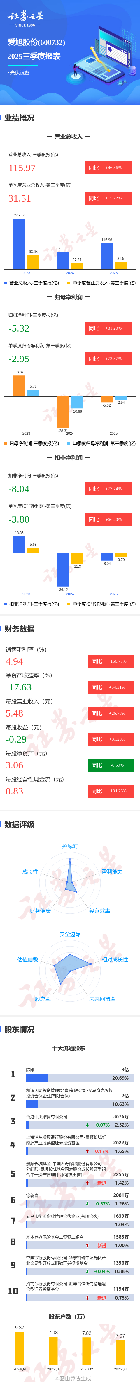 证券之星消息,爱旭股份2025年三季报显示,前三季度公司主营收入115.97亿元,同比上升46.86%;归母净利润-5.32亿元,同比上升81.2%;扣非净利润-8.04亿元,同比上升77.74%;其中2025年第三季度,公司单季度主营收入31.51亿元,同比上升15.22%;单季度归母净利润-2.95亿元,同比上升72.88%;单季度扣非净利润-3.8亿元,同比上升66.41%;负债率77.6%,投资收益-915.99万元,财务费用8874.48万元,毛利率4.94%。