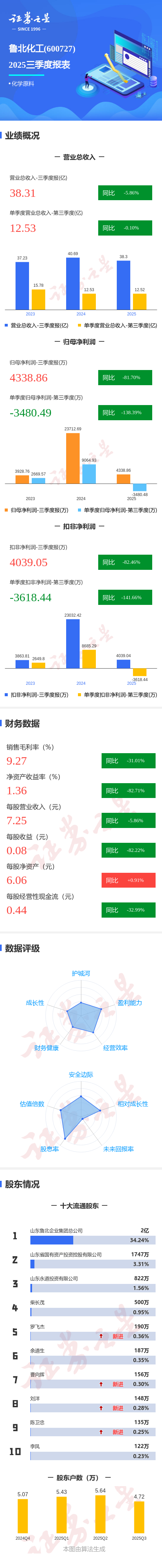 证券之星消息,鲁北化工2025年三季报显示,前三季度公司主营收入38.31亿元,同比下降5.86%;归母净利润4338.86万元,同比下降81.7%;扣非净利润4039.05万元,同比下降82.46%;其中2025年第三季度,公司单季度主营收入12.53亿元,同比下降0.1%;单季度归母净利润-3480.49万元,同比下降138.4%;单季度扣非净利润-3618.44万元,同比下降141.66%;负债率59.16%,投资收益64.63万元,财务费用854.05万元,毛利率9.27%。