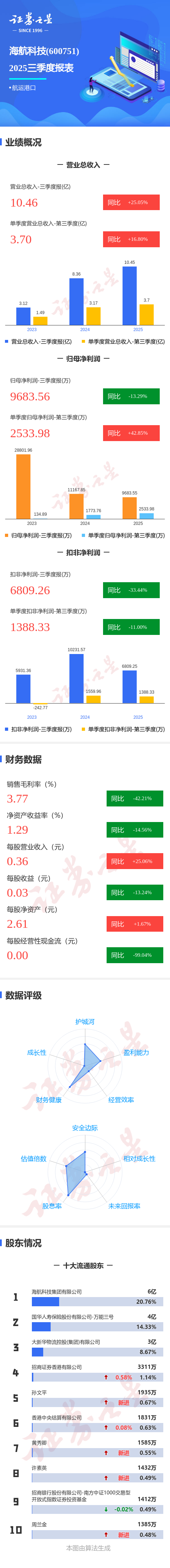 证券之星消息,海航科技2025年三季报显示,前三季度公司主营收入10.46亿元,同比上升25.06%;归母净利润9683.56万元,同比下降13.29%;扣非净利润6809.26万元,同比下降33.45%;其中2025年第三季度,公司单季度主营收入3.7亿元,同比上升16.8%;单季度归母净利润2533.98万元,同比上升42.86%;单季度扣非净利润1388.33万元,同比下降11.0%;负债率23.28%,投资收益4776.39万元,财务费用-4628.73万元,毛利率3.77%。