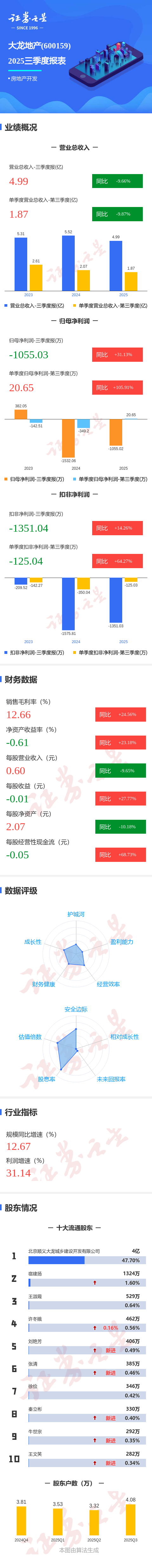 证券之星消息,大龙地产2025年三季报显示,前三季度公司主营收入4.99亿元,同比下降9.66%;归母净利润-1055.03万元,同比上升31.14%;扣非净利润-1351.04万元,同比上升14.26%;其中2025年第三季度,公司单季度主营收入1.87亿元,同比下降9.88%;单季度归母净利润20.65万元,同比上升105.91%;单季度扣非净利润-125.04万元,同比上升64.28%;负债率44.75%,财务费用-85.63万元,毛利率12.66%。