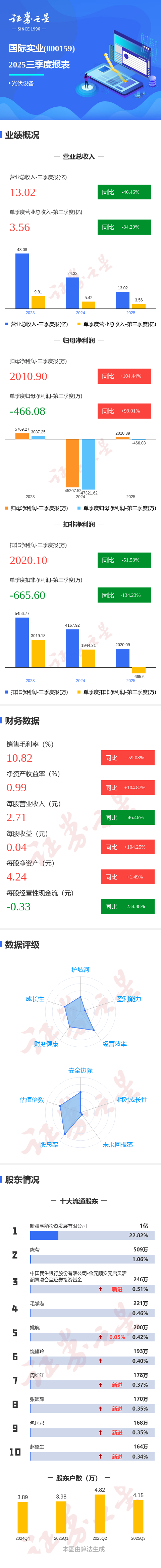 证券之星消息,国际实业2025年三季报显示,前三季度公司主营收入13.02亿元,同比下降46.47%;归母净利润2010.9万元,同比上升104.45%;扣非净利润2020.1万元,同比下降51.53%;其中2025年第三季度,公司单季度主营收入3.56亿元,同比下降34.29%;单季度归母净利润-466.08万元,同比上升99.02%;单季度扣非净利润-665.6万元,同比下降134.23%;负债率43.35%,投资收益0.0万元,财务费用3662.48万元,毛利率10.82%。