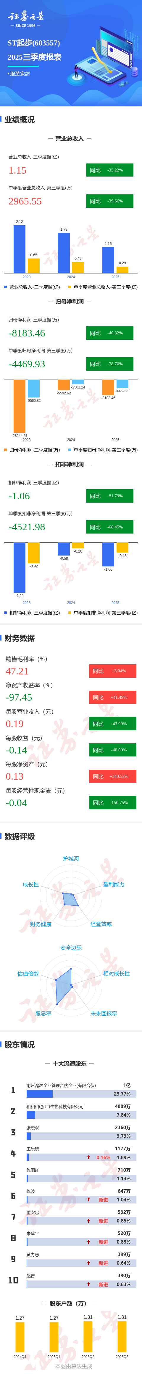 证券之星消息,ST起步2025年三季报显示,前三季度公司主营收入1.15亿元,同比下降35.22%;归母净利润-8183.46万元,同比下降46.33%;扣非净利润-1.06亿元,同比下降81.8%;其中2025年第三季度,公司单季度主营收入2965.55万元,同比下降39.66%;单季度归母净利润-4469.93万元,同比下降78.71%;单季度扣非净利润-4521.98万元,同比下降68.45%;负债率88.95%,财务费用-2067.57万元,毛利率47.21%。