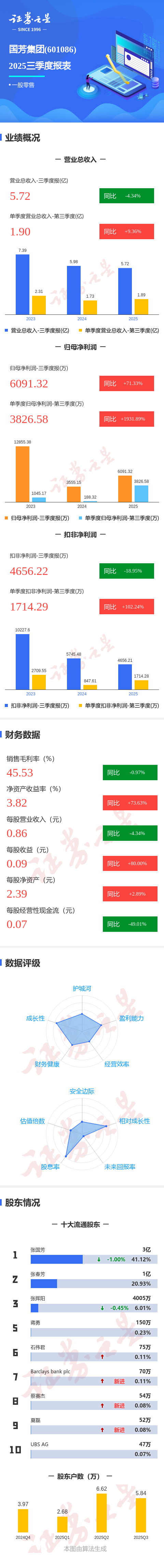 证券之星消息,国芳集团2025年三季报显示,前三季度公司主营收入5.72亿元,同比下降4.35%;归母净利润6091.32万元,同比上升71.34%;扣非净利润4656.22万元,同比下降18.96%;其中2025年第三季度,公司单季度主营收入1.9亿元,同比上升9.36%;单季度归母净利润3826.58万元,同比上升1931.9%;单季度扣非净利润1714.29万元,同比上升102.25%;负债率42.76%,投资收益1831.18万元,财务费用174.11万元,毛利率45.53%。
