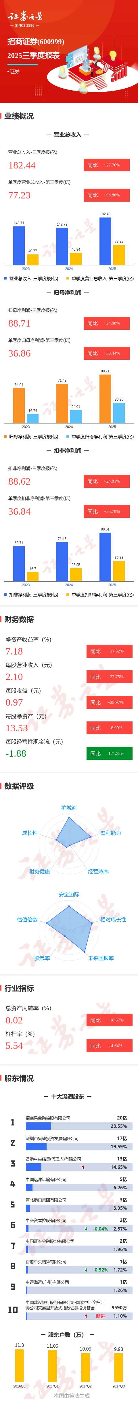 证券之星消息,招商证券2025年三季报显示,前三季度公司主营收入182.44亿元,同比上升27.76%;归母净利润88.71亿元,同比上升24.08%;扣非净利润88.62亿元,同比上升24.02%;其中2025年第三季度,公司单季度主营收入77.23亿元,同比上升64.89%;单季度归母净利润36.86亿元,同比上升53.45%;单季度扣非净利润36.84亿元,同比上升53.79%;负债率81.93%,投资收益96.76亿元。