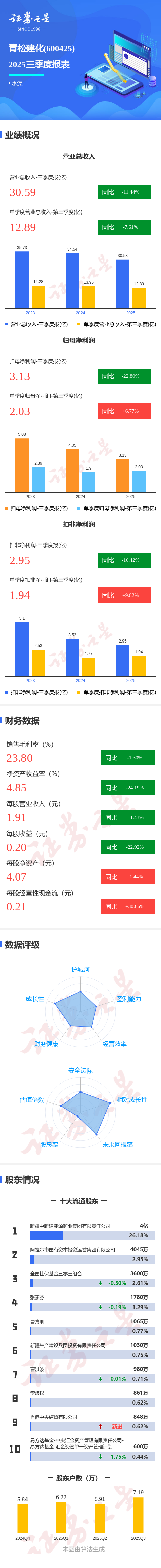 证券之星消息,青松建化2025年三季报显示,前三季度公司主营收入30.59亿元,同比下降11.44%;归母净利润3.13亿元,同比下降22.81%;扣非净利润2.95亿元,同比下降16.42%;其中2025年第三季度,公司单季度主营收入12.89亿元,同比下降7.62%;单季度归母净利润2.03亿元,同比上升6.78%;单季度扣非净利润1.94亿元,同比上升9.83%;负债率29.08%,投资收益2474.95万元,财务费用2431.39万元,毛利率23.8%。