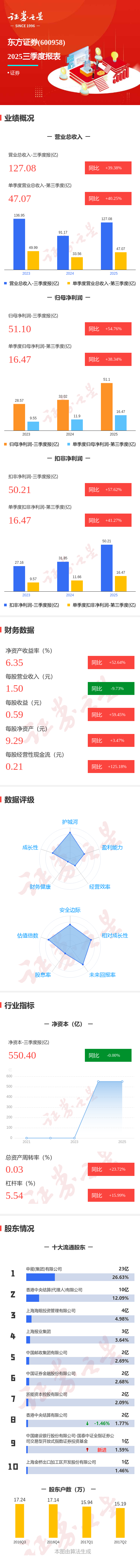 证券之星消息,东方证券2025年三季报显示,前三季度公司主营收入127.08亿元,同比上升39.38%;归母净利润51.1亿元,同比上升54.76%;扣非净利润50.21亿元,同比上升57.63%;其中2025年第三季度,公司单季度主营收入47.07亿元,同比上升40.25%;单季度归母净利润16.47亿元,同比上升38.35%;单季度扣非净利润16.47亿元,同比上升41.28%;负债率81.95%,投资收益58.31亿元。