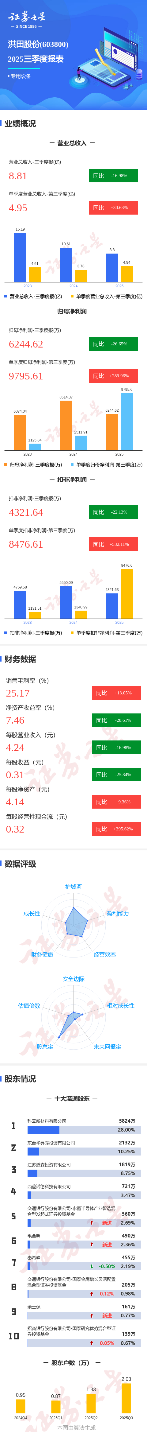 证券之星消息,洪田股份2025年三季报显示,前三季度公司主营收入8.81亿元,同比下降16.99%;归母净利润6244.62万元,同比下降26.66%;扣非净利润4321.64万元,同比下降22.13%;其中2025年第三季度,公司单季度主营收入4.95亿元,同比上升30.64%;单季度归母净利润9795.61万元,同比上升289.97%;单季度扣非净利润8476.61万元,同比上升532.11%;负债率62.79%,投资收益392.33万元,财务费用1896.17万元,毛利率25.17%。