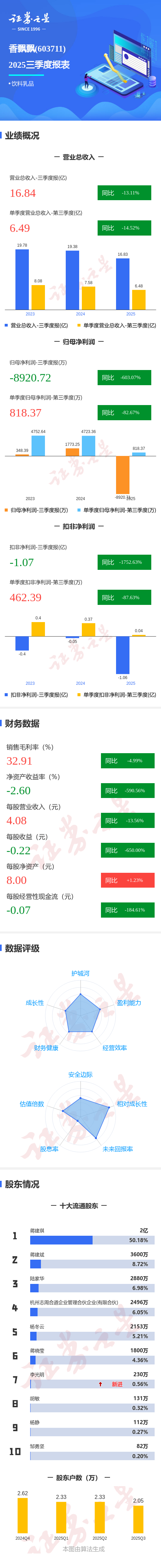 证券之星消息,香飘飘2025年三季报显示,前三季度公司主营收入16.84亿元,同比下降13.12%;归母净利润-8920.72万元,同比下降603.07%;扣非净利润-1.07亿元,同比下降1752.64%;其中2025年第三季度,公司单季度主营收入6.49亿元,同比下降14.53%;单季度归母净利润818.37万元,同比下降82.67%;单季度扣非净利润462.39万元,同比下降87.64%;负债率30.1%,投资收益820.05万元,财务费用-1649.0万元,毛利率32.91%。