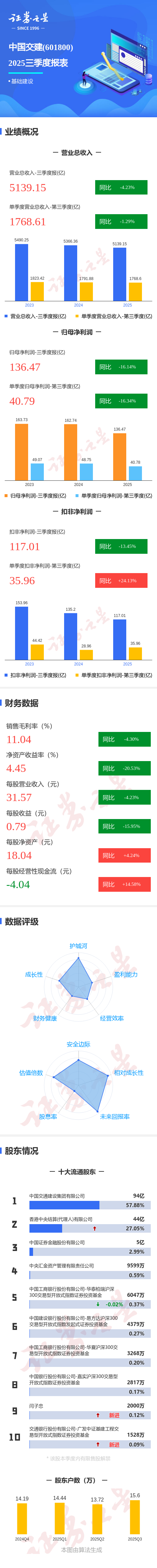 证券之星消息,中国交建2025年三季报显示,前三季度公司主营收入5139.15亿元,同比下降4.23%;归母净利润136.47亿元,同比下降16.14%;扣非净利润117.01亿元,同比下降13.45%;其中2025年第三季度,公司单季度主营收入1768.61亿元,同比下降1.3%;单季度归母净利润40.79亿元,同比下降16.34%;单季度扣非净利润35.96亿元,同比上升24.13%;负债率76.2%,投资收益-3.85亿元,财务费用3.4亿元,毛利率11.04%。