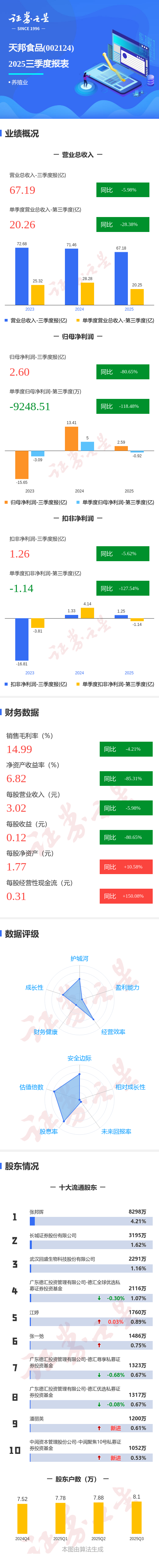 证券之星消息,天邦食品2025年三季报显示,前三季度公司主营收入67.19亿元,同比下降5.98%;归母净利润2.6亿元,同比下降80.65%;扣非净利润1.26亿元,同比下降5.62%;其中2025年第三季度,公司单季度主营收入20.26亿元,同比下降28.39%;单季度归母净利润-9248.51万元,同比下降118.48%;单季度扣非净利润-1.14亿元,同比下降127.55%;负债率70.27%,投资收益1.62亿元,财务费用2.68亿元,毛利率14.99%。