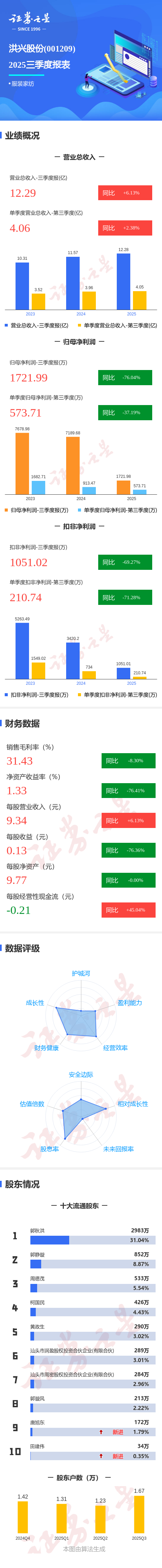 证券之星消息,洪兴股份2025年三季报显示,前三季度公司主营收入12.29亿元,同比上升6.13%;归母净利润1721.99万元,同比下降76.05%;扣非净利润1051.02万元,同比下降69.27%;其中2025年第三季度,公司单季度主营收入4.06亿元,同比上升2.39%;单季度归母净利润573.71万元,同比下降37.19%;单季度扣非净利润210.74万元,同比下降71.29%;负债率34.34%,投资收益100.24万元,财务费用306.79万元,毛利率31.43%。