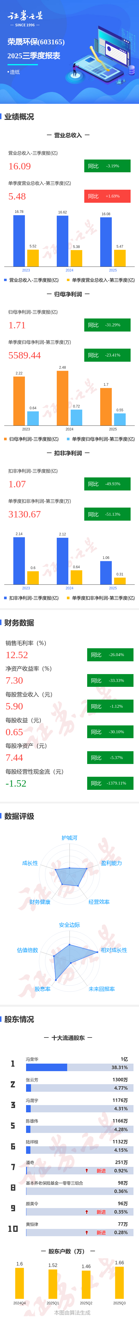证券之星消息,荣晟环保2025年三季报显示,前三季度公司主营收入16.09亿元,同比下降3.19%;归母净利润1.71亿元,同比下降31.3%;扣非净利润1.07亿元,同比下降49.94%;其中2025年第三季度,公司单季度主营收入5.48亿元,同比上升1.7%;单季度归母净利润5589.44万元,同比下降23.41%;单季度扣非净利润3130.67万元,同比下降51.13%;负债率56.74%,投资收益945.89万元,财务费用4685.46万元,毛利率12.52%。