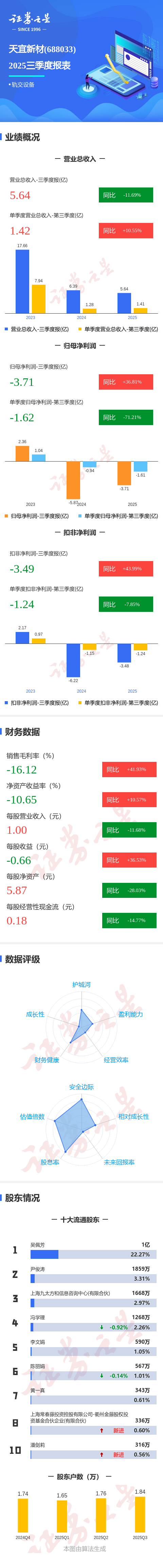 证券之星消息,天宜新材2025年三季报显示,前三季度公司主营收入5.64亿元,同比下降11.69%;归母净利润-3.71亿元,同比上升36.82%;扣非净利润-3.49亿元,同比上升44.0%;其中2025年第三季度,公司单季度主营收入1.42亿元,同比上升10.56%;单季度归母净利润-1.62亿元,同比下降71.21%;单季度扣非净利润-1.24亿元,同比下降7.85%;负债率42.57%,投资收益527.65万元,财务费用4755.66万元,毛利率-16.12%。