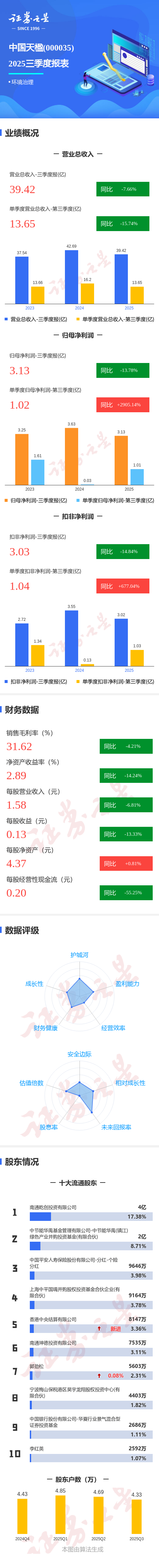 证券之星消息,中国天楹2025年三季报显示,前三季度公司主营收入39.42亿元,同比下降7.66%;归母净利润3.13亿元,同比下降13.79%;扣非净利润3.03亿元,同比下降14.84%;其中2025年第三季度,公司单季度主营收入13.65亿元,同比下降15.75%;单季度归母净利润1.02亿元,同比上升2905.15%;单季度扣非净利润1.04亿元,同比上升677.04%;负债率65.62%,投资收益-282.41万元,财务费用3.79亿元,毛利率31.61%。