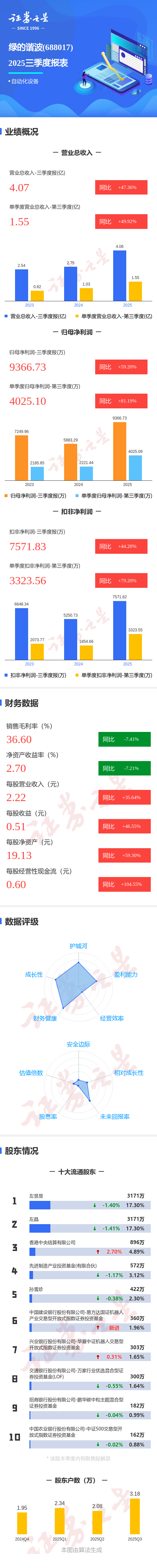 证券之星消息,绿的谐波2025年三季报显示,前三季度公司主营收入4.07亿元,同比上升47.36%;归母净利润9366.73万元,同比上升59.21%;扣非净利润7571.83万元,同比上升44.21%;其中2025年第三季度,公司单季度主营收入1.55亿元,同比上升49.92%;单季度归母净利润4025.1万元,同比上升81.19%;单季度扣非净利润3323.56万元,同比上升79.2%;负债率9.83%,投资收益2470.43万元,财务费用187.73万元,毛利率36.6%。