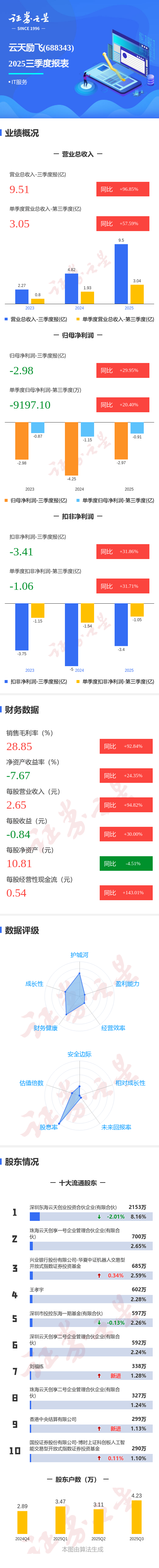 证券之星消息,云天励飞2025年三季报显示,前三季度公司主营收入9.51亿元,同比上升96.85%;归母净利润-2.98亿元,同比上升29.95%;扣非净利润-3.41亿元,同比上升31.86%;其中2025年第三季度,公司单季度主营收入3.05亿元,同比上升57.59%;单季度归母净利润-9197.1万元,同比上升20.41%;单季度扣非净利润-1.06亿元,同比上升31.71%;负债率31.63%,投资收益1720.09万元,财务费用1945.47万元,毛利率28.85%。