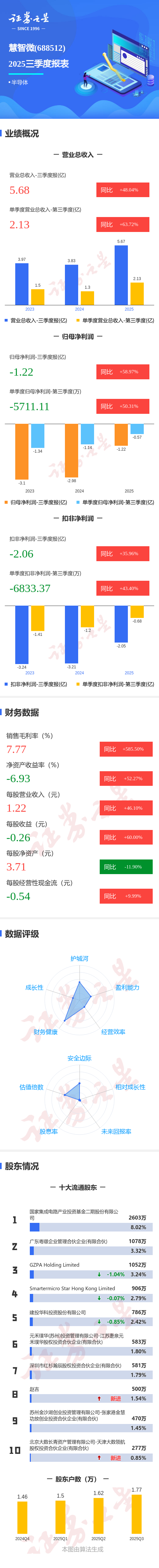 证券之星消息,慧智微2025年三季报显示,前三季度公司主营收入5.68亿元,同比上升48.04%;归母净利润-1.22亿元,同比上升58.98%;扣非净利润-2.06亿元,同比上升35.96%;其中2025年第三季度,公司单季度主营收入2.13亿元,同比上升63.73%;单季度归母净利润-5711.11万元,同比上升50.31%;单季度扣非净利润-6833.37万元,同比上升43.41%;负债率24.86%,投资收益195.24万元,财务费用-427.49万元,毛利率7.77%。