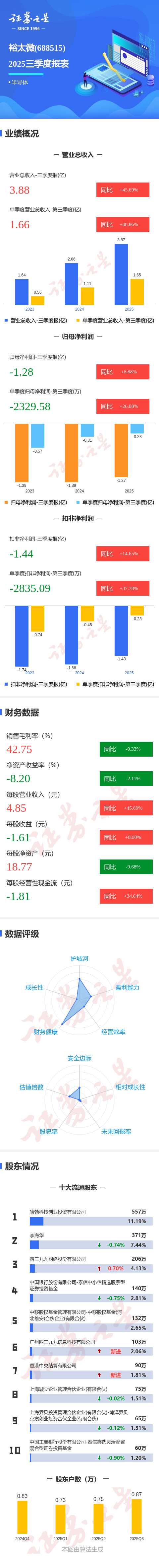 证券之星消息,裕太微2025年三季报显示,前三季度公司主营收入3.88亿元,同比上升45.7%;归母净利润-1.28亿元,同比上升8.89%;扣非净利润-1.44亿元,同比上升14.66%;其中2025年第三季度,公司单季度主营收入1.66亿元,同比上升48.87%;单季度归母净利润-2329.58万元,同比上升26.08%;单季度扣非净利润-2835.09万元,同比上升37.79%;负债率9.5%,投资收益722.85万元,财务费用-50.02万元,毛利率42.75%。