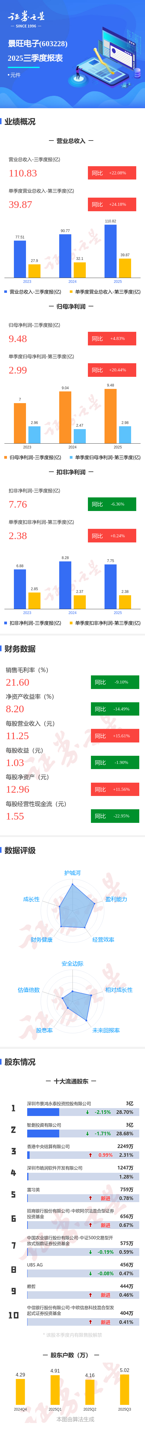 证券之星消息,景旺电子2025年三季报显示,前三季度公司主营收入110.83亿元,同比上升22.08%;归母净利润9.48亿元,同比上升4.83%;扣非净利润7.76亿元,同比下降6.36%;其中2025年第三季度,公司单季度主营收入39.87亿元,同比上升24.19%;单季度归母净利润2.99亿元,同比上升20.44%;单季度扣非净利润2.38亿元,同比上升0.25%;负债率43.05%,投资收益-1265.11万元,财务费用1966.04万元,毛利率21.6%。