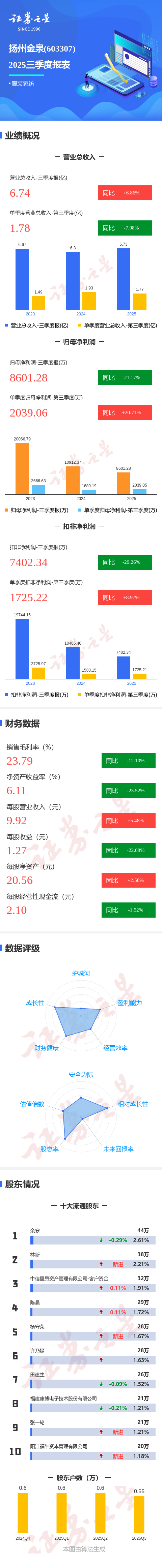证券之星消息,扬州金泉2025年三季报显示,前三季度公司主营收入6.74亿元,同比上升6.86%;归母净利润8601.28万元,同比下降21.18%;扣非净利润7402.34万元,同比下降29.27%;其中2025年第三季度,公司单季度主营收入1.78亿元,同比下降7.98%;单季度归母净利润2039.06万元,同比上升20.71%;单季度扣非净利润1725.22万元,同比上升8.97%;负债率14.96%,投资收益2446.58万元,财务费用-559.98万元,毛利率23.79%。