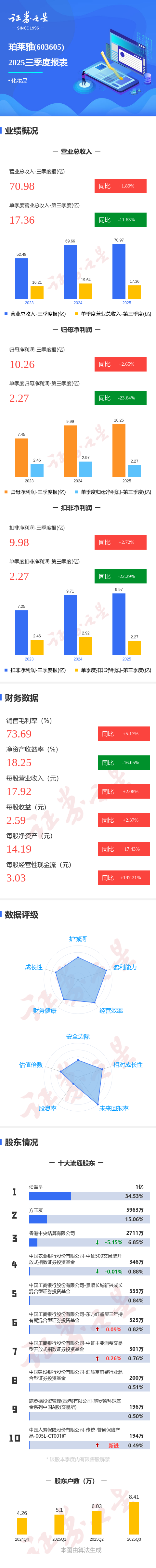 证券之星消息,珀莱雅2025年三季报显示,前三季度公司主营收入70.98亿元,同比上升1.89%;归母净利润10.26亿元,同比上升2.65%;扣非净利润9.98亿元,同比上升2.72%;其中2025年第三季度,公司单季度主营收入17.36亿元,同比下降11.63%;单季度归母净利润2.27亿元,同比下降23.64%;单季度扣非净利润2.27亿元,同比下降22.3%;负债率32.61%,投资收益642.06万元,财务费用-2922.28万元,毛利率73.69%。