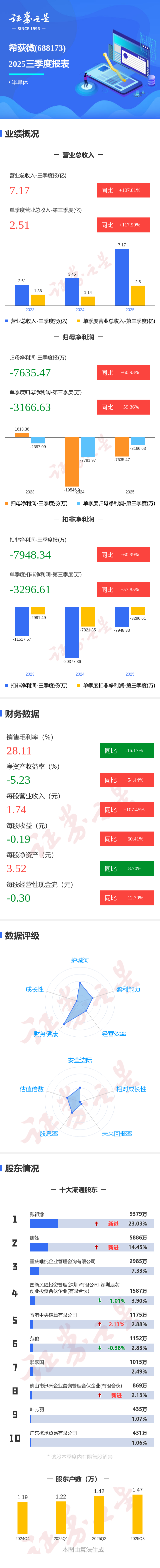 证券之星消息,希荻微2025年三季报显示,前三季度公司主营收入7.17亿元,同比上升107.81%;归母净利润-7635.47万元,同比上升60.94%;扣非净利润-7948.34万元,同比上升60.99%;其中2025年第三季度,公司单季度主营收入2.51亿元,同比上升117.99%;单季度归母净利润-3166.63万元,同比上升59.36%;单季度扣非净利润-3296.61万元,同比上升57.85%;负债率16.68%,投资收益393.59万元,财务费用-924.11万元,毛利率28.11%。