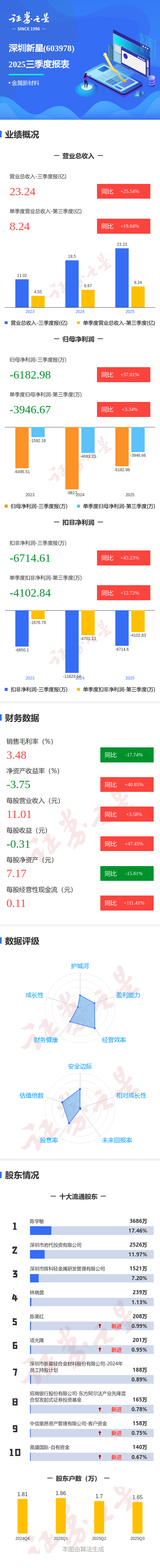证券之星消息,深圳新星2025年三季报显示,前三季度公司主营收入23.24亿元,同比上升25.54%;归母净利润-6182.98万元,同比上升37.02%;扣非净利润-6714.61万元,同比上升43.23%;其中2025年第三季度,公司单季度主营收入8.24亿元,同比上升19.84%;单季度归母净利润-3946.67万元,同比上升3.34%;单季度扣非净利润-4102.84万元,同比上升12.73%;负债率60.31%,投资收益-489.79万元,财务费用4409.1万元,毛利率3.48%。